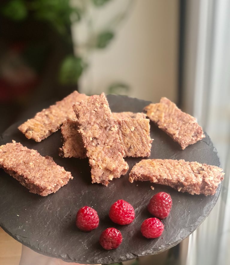 Recette des barres de céréales protéinées de Syvri à base de flocons d'avoine, de raisins, d'amandes, de noisettes et de framboises.