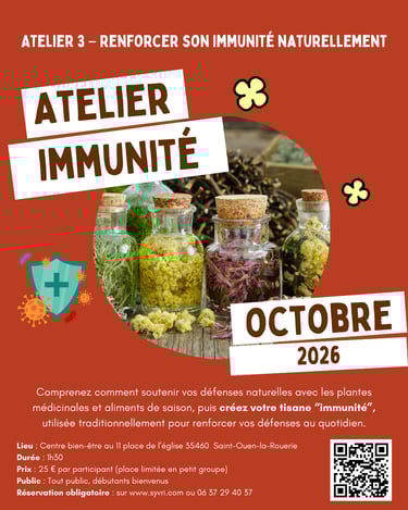 🍁 Atelier 3 – Renforcer son immunité naturellement : Comprenez comment soutenir vos défenses naturelles avec les plantes médicinales et aliments de saison, puis créez votre tisane “immunité”, utilisée traditionnellement pour renforcer vos défenses au quotidien. Vous repartez avec votre tisane et des conseils pratiques pour la saison.