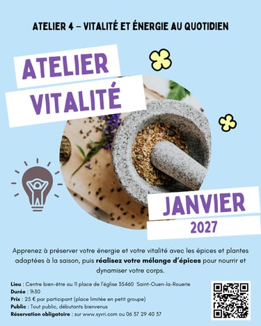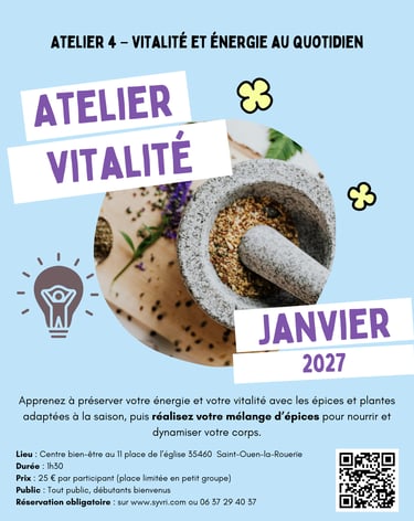 ❄️ Atelier 4 – Vitalité et énergie au quotidien : Apprenez à préserver votre énergie et votre vitalité avec les épices et plantes adaptées à la saison, puis réalisez votre mélange d’épices pour nourrir et dynamiser votre corps. Vous repartez avec votre préparation et des idées d’utilisation.